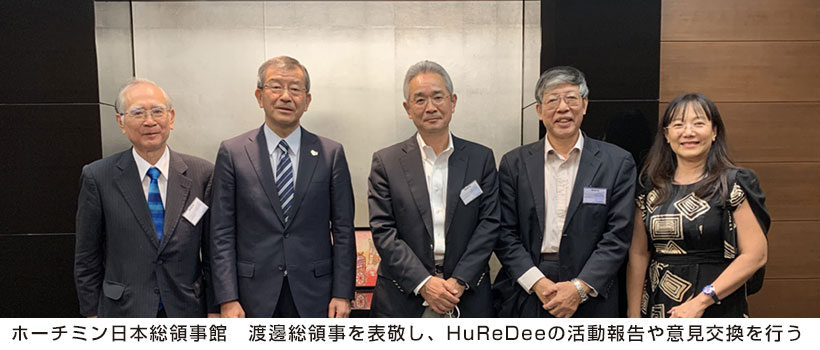 10月11日 ホーチミン日本総領事館 渡邊総領事を表敬致しました。藤島理事長よりHuReDee活動を報告し、日本政府より日本語教育機材が無償提供されたホーチミン情報技術大学(UIT)でのHuReDeeクラス第4期開講状況を説明。また、藤島理事長が創設に関わった越日工業大学(VJIT)についても意見交換がなされ、渡邊総領事もVJITイベントに出席しているとの話が合った。